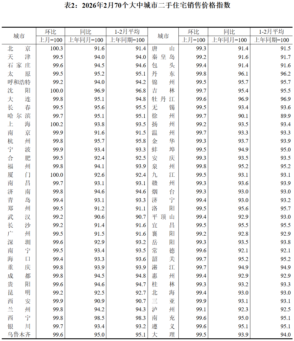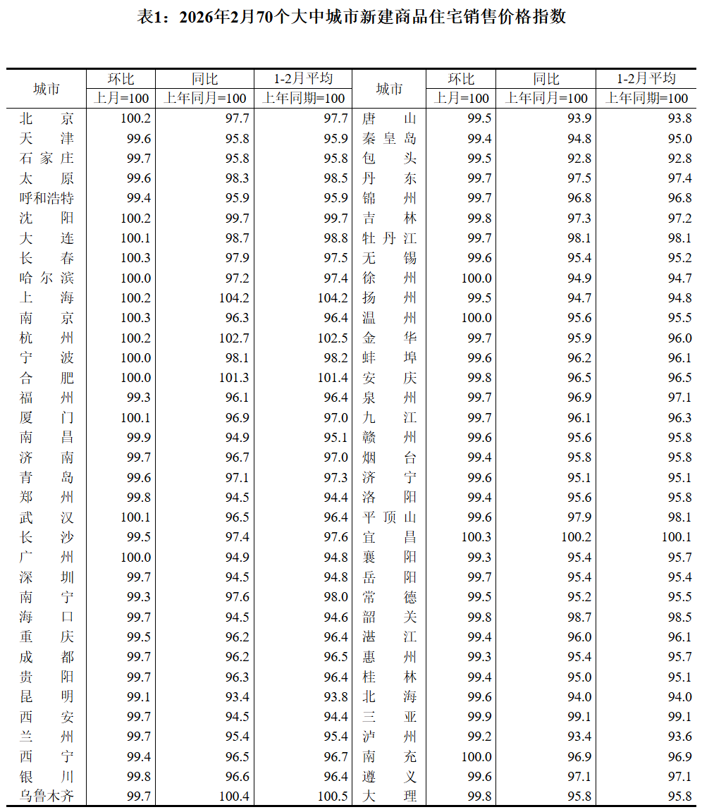就在刚刚,国家统计局发布了《2026年2月份70个大中城市商品住宅销售价格变动情况》,最新的房价走势数据出来了。